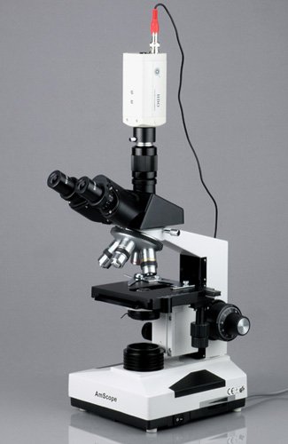 The T490A features a unique "simul-focal" optical system with an adjustable trinocular port to enable well-focused clear images on your PC or video screen while simultaneously obtaining sharp, focused images through the eyepieces. Most trinocular microscopes allow you to view either through the trinocular port or the eyepieces only, forcing you to switch between the two. Since these trinocular ports are not "simul-focal" with the rest of the microscope optical system, you have to re-focus the microscope after each switch. The T490A, however, erases this step by providing "simul-focal" viewing. Especially handy for teaching demonstrations, clinical examinations and laboratory applications, the "simul-focal" feature allows your students or colleagues to view clear images simultaneously while you work through the eyepieces. In addition, the T490A's industry standard 23mm photo port can be converted into a C-Mount port by attaching the included C-mount adapter, allowing you to attach most microscope digital cameras and video systems on the market.