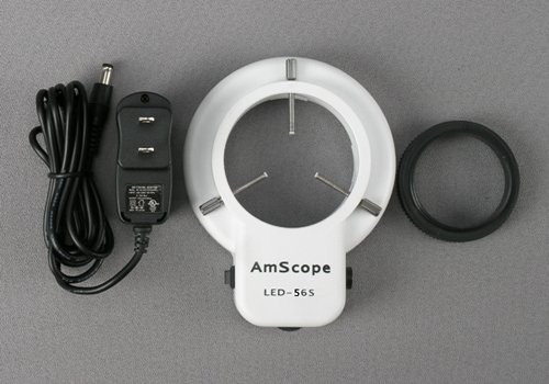 You are bidding on a 56-LED ring light with built-in intensity control and mounting size up to 2-1/4" (58mm) in diameter. The ring light has 2-3/16" (56mm) inside and 3-3/4" (95mm) outside diameters. It works with power supplies from 110V to 240V. It comes with a 1-7/8" (48mm in diameter) ring adapter. With variable intensity control, it provides cool, even, intense and focused shadow-free illumination. It is an ideal durable cool light source for microscopes. This kit comes with one year warranty against manufacturing defects. It is brand new in original box.